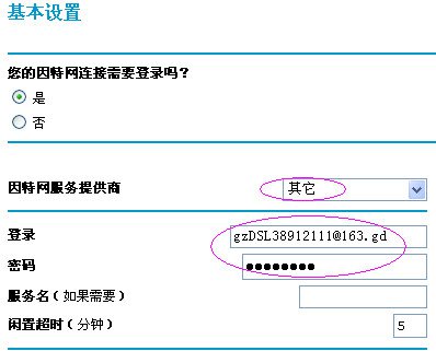 然后启动浏览器,在地址栏中输入http://192.168.1.1/basicsetting.htm后回车,就进入了路由器的配置界面,默认进入的是基本设置页面,ADSL的家庭用户通常只需在此页设置好ADSL的帐号和密码就行了,如图: